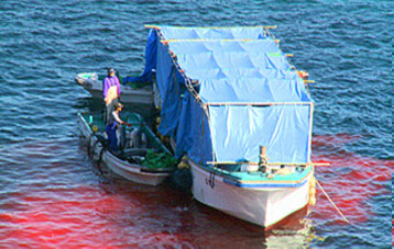 In der Bucht werden die Delfine lediglich getötet, aber nicht weiter verarbeitet. Dies geschieht entweder im nahen Hafen, oder wie hier gezeigt, auf dem Wasser unweit der Bucht an Bord der "Isana". Normalerweise liegt das Boot im Hafen von Taiji, aber sobald die Fangtätigkeit läuft, fährt das Boot in Richtung Bucht und wartet auf getötete Delfine, die zum Boot gebracht werden. Dort werden diese ausgenommen, von einem der Fangboote übernommen und zum Hafen transportiert.