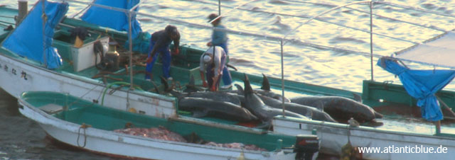 An Bord des Bootes und abseits des Ufers fühlen sich die Fänger oftmals unbeobachtet und geben sich wenig Mühe, ihre blutige Arbeit mit Abdeckplanen zu verdecken, so wie in der Bucht. Doch nach Veröffentlichung obiger Aufnahme, verbargen sich die Delfinfänger nun auch während ihrer Arbeit an Bord dieses Bootes mit blauen Planen.