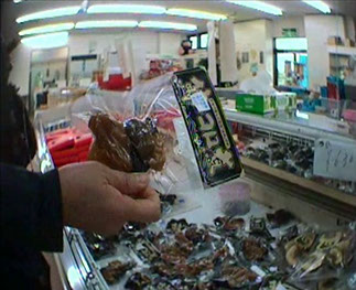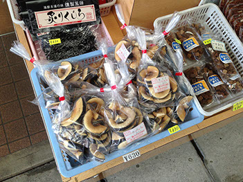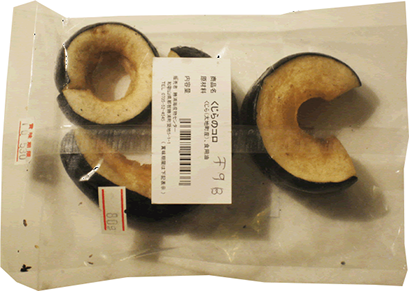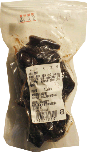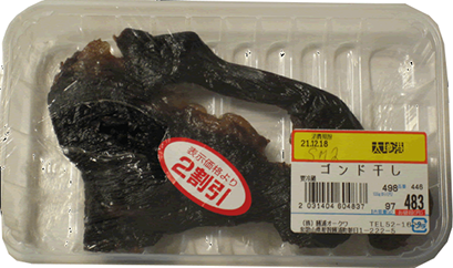 Ein typisches Delfinprodukt, dass überall zu finden ist. Es handelt sich dabei um Stücke von fast schwarzer Haut mit der darunterliegenden Speckschicht. Das Fleisch wird getrocknet und ist so auch ohne Kühlung längere Zeit haltbar. Beim Trocknungsprozeß krümmt es sich und bildet diese typische Form.